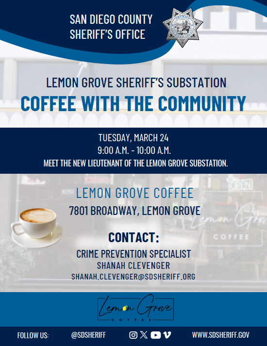 The staff at the Lemon Grove Sheriff's Substation understands we cannot stop crime from occurring on our own and actively seek opportunities to partner with our communities to find long-lasting safety solutions. We use an Information Led Policing (ILP) model to put our deputies in the right place to interrupt crimes in progress and use a proactive crime prevention model to get the word out to the community about crime trends and community concerns.