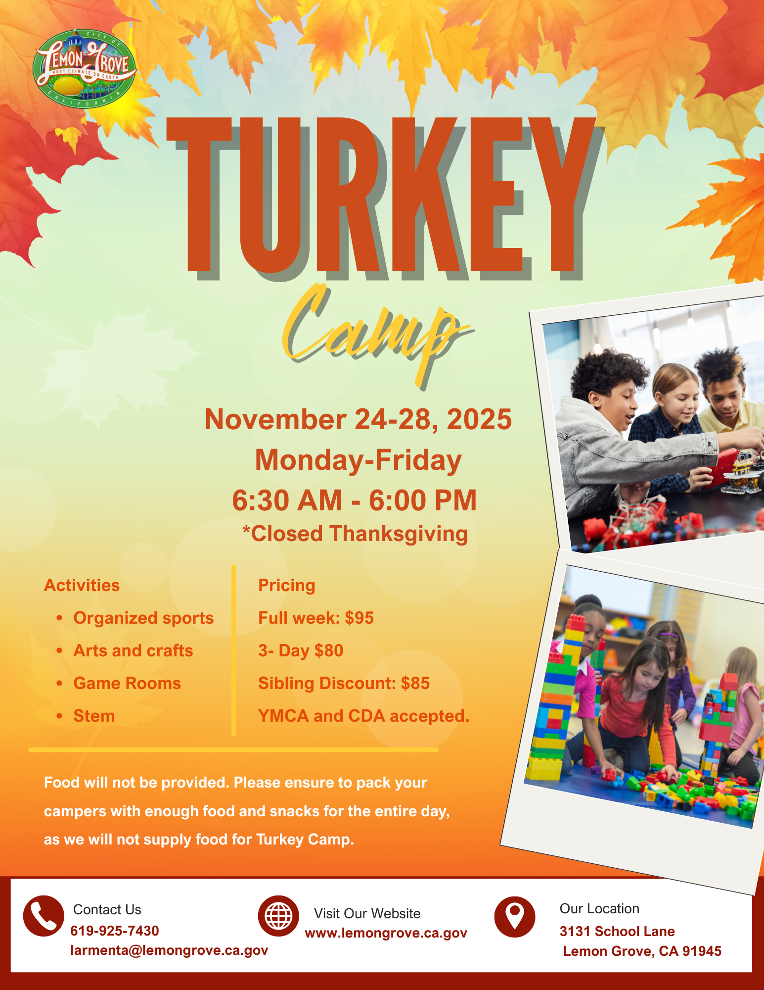 - Refrain from bringing any valuables to camp, the City will not be responsible for lost or stolen items